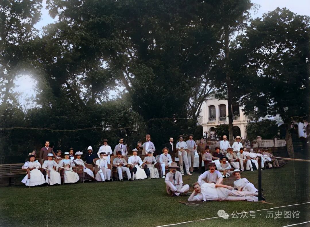 广州沙面岛上,一些英国人在打网球。有专门的网球场地,一些身穿长裙的英国贵族女子坐在场边观看。看到摄影师拍照,几名男子在草地上摆出了滑稽的造型。在他们身后的绿树丛中,有欧式的别墅建筑。