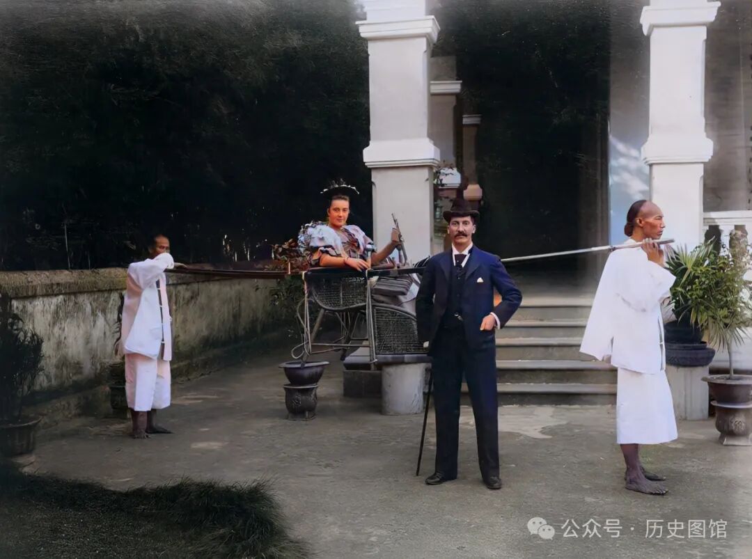 在广州一座欧式别墅前,站着一名身穿西服头戴礼帽的英国男子。在他身后,一名女子正坐在轿子上。两名受雇佣的中国轿夫,抬着轿子准备出门。照片拍摄于1870年。