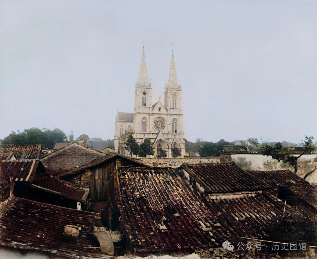 摄影师站在高处向远处看,一座高大的教堂映入眼帘——圣心大教堂。该教堂位于今越秀区一德路,始建于1863年,历时25年始建成,因该教堂由花岗岩石建造,因此也被人们称为“石室”。广州圣心大教堂,是国内现存最宏伟的双尖塔哥特式建筑之一。