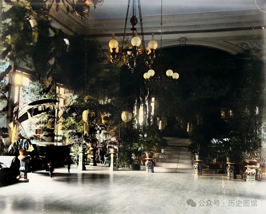 这是当时位于广州的一座豪华舞厅的大堂,风格中西合璧。有欧式的吊灯、中式的宫灯、古老的钢琴和沙发。大堂四周布置着很多盆栽植物,有芭蕉、竹子等,看上去充满了生机。
