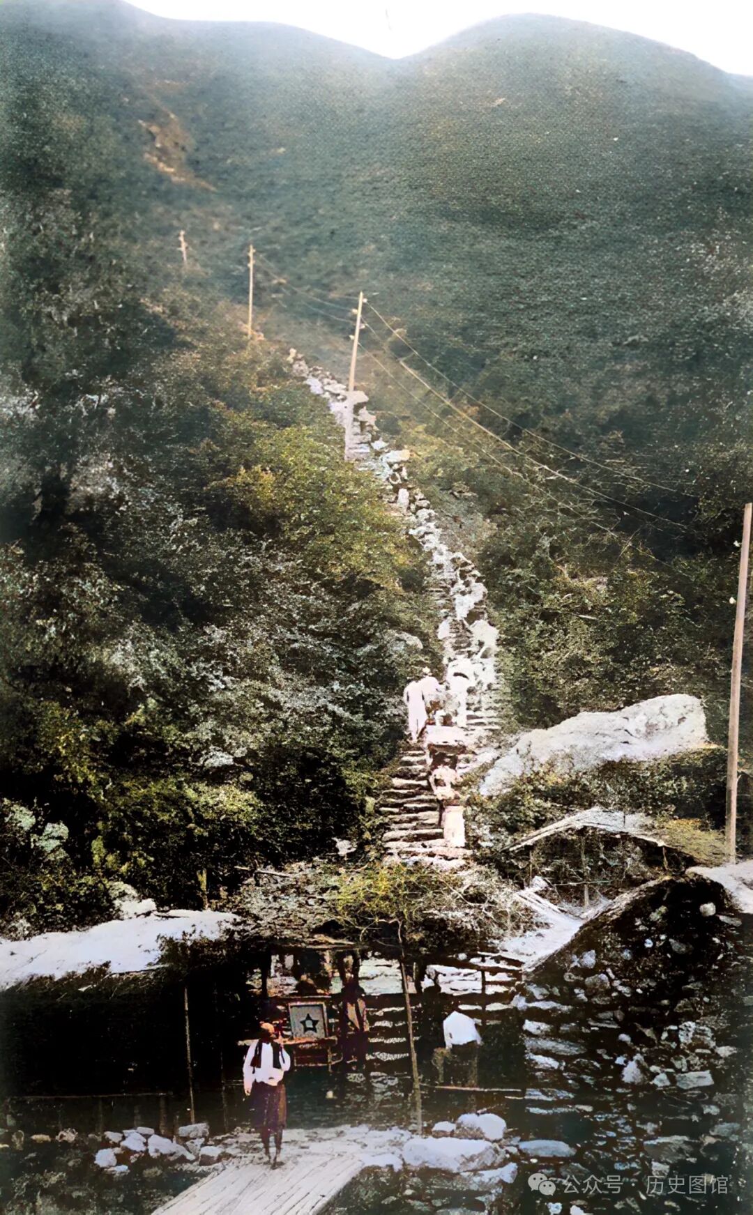照片中,关门前的小桥上,走来两名轿夫,上面坐着一名游客。一条石头台阶小路,向山上延伸。