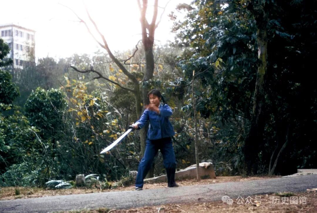 1972年,位于无锡惠山的一条小路上,一名女子手里拿着一把钢刀,正在练习传统武术。她可能出身武术世家,从小就开始了习武生涯。