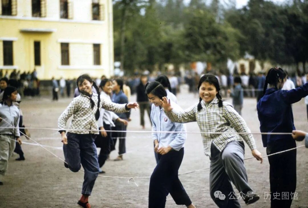 这张照片,是在课间休息时间拍摄的。活泼可爱的女生们,在操场上跳皮筋。在那个物质和文化生活匮乏的年代,这也许是她们最好的休闲娱乐方式了。