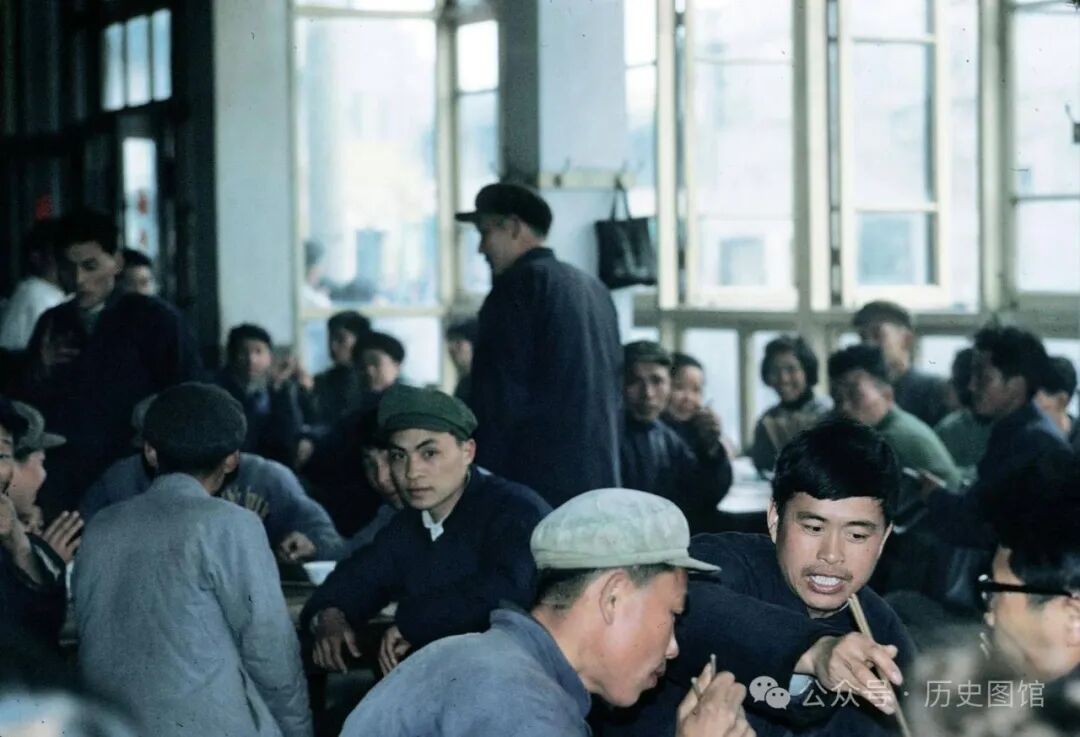 当时的人们,衣着大部分是蓝色的中山装和绿色的军装,颜色看上的很单一。这样的画面很有年代感。