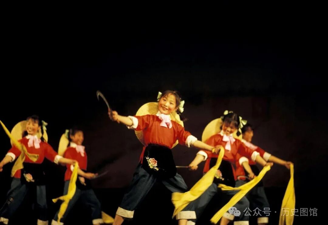 1972年,在江苏无锡一场大型晚会上,几名小学生扮演农民,她们背着草帽手拿镰刀。随着音乐翩翩起舞。画面,太有年代感了。这样的节目形式,能起到振奋人心鼓舞斗志的作用。