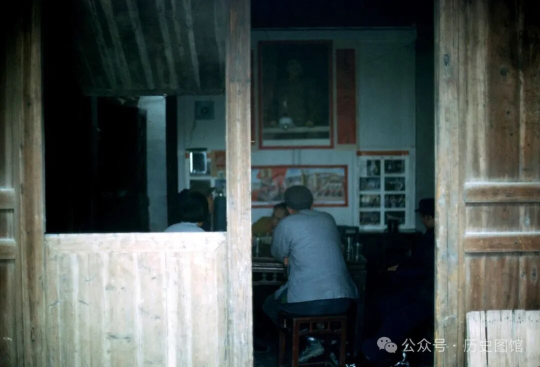 在无锡一个小饭店里,几名男子正坐在方桌前喝茶聊天。屋子里对着门的墙壁上,贴着中堂画和对联,下面还贴着智取威虎山的宣传画。在当时,很多人家里都是这样布置的。