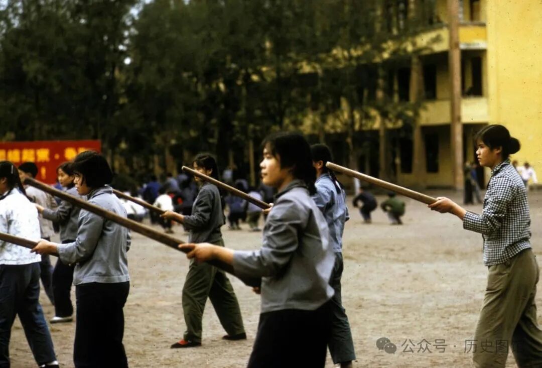 1972年,无锡一所中学,学生们正在上体育课。她们每人手里拿着一支“枪”,英姿飒爽。不过,枪是用木头做的,女生们正在练习拼刺。