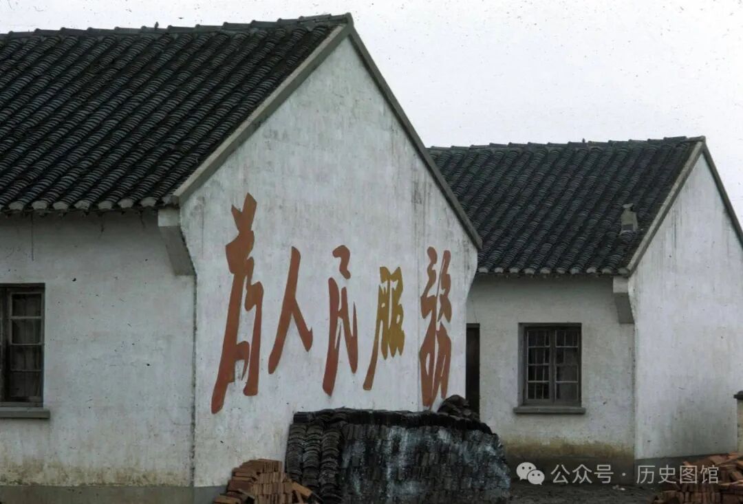 这张照片,配有简短的文字说明:1972年,无锡河埒村。这两栋房屋,可能是河埒村大队部所在地。白色的墙壁上,写着“为人民服务”几个大字。墙根处堆放着一些砖头和瓦片。