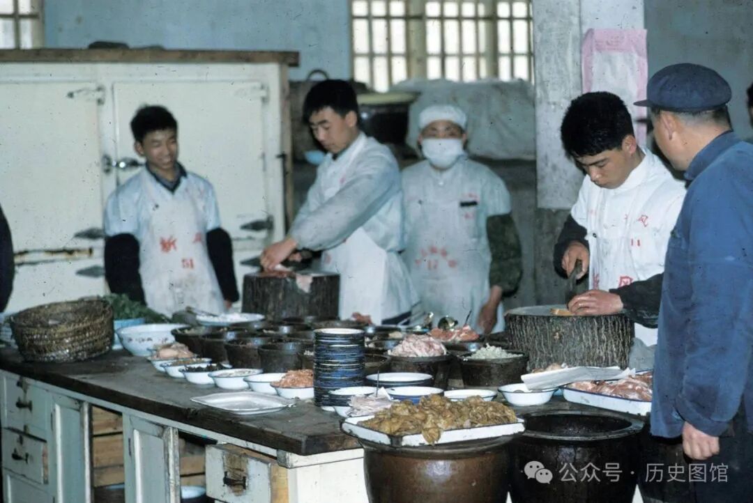 1972年,在无锡新风饭店里,摄影师拍下了后厨里的景象。大厨们做菜时的情景。厨师们身穿白大褂,正在菜墩上切菜,刀工纯熟老练。