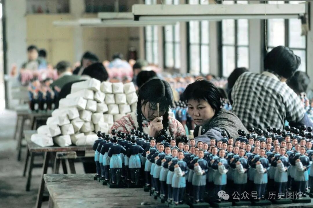 1972年,江苏无锡一个黏土娃娃厂里,女工们正在为制作好的玩具娃娃涂上颜色。无锡的惠山泥人非常有名。据说。它是用惠山地区一米以下的土为材料,又经过多道工序制作而成。