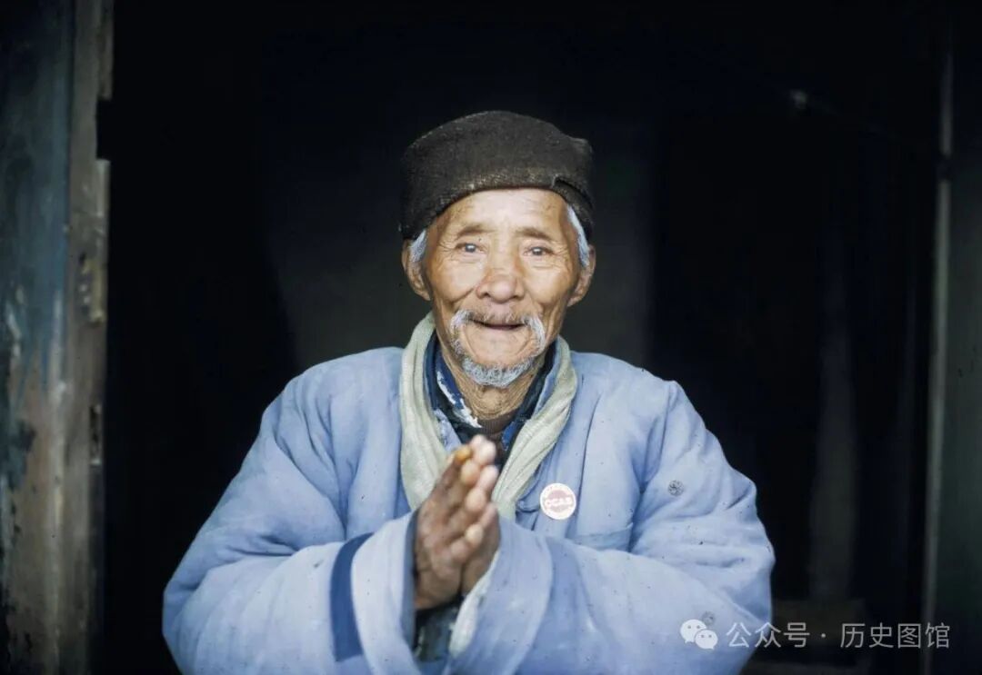 1972年,无锡河埒大队的一名老翁,站在自家房门口。他身穿棉袍,头戴棉帽。