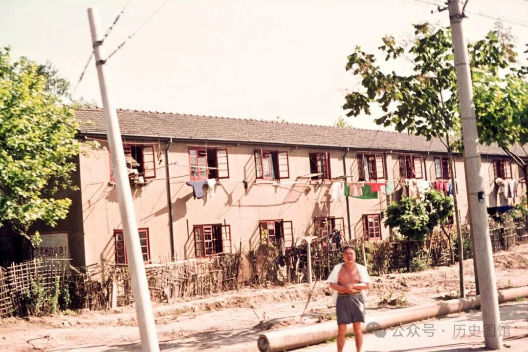 1972年夏天,位于江苏无锡一家工厂职工宿舍外面的景象。宿舍楼有两层,朝南的窗户上,晾晒着很多衣服。看来这家工厂工人们的居住条件还是很不错的。