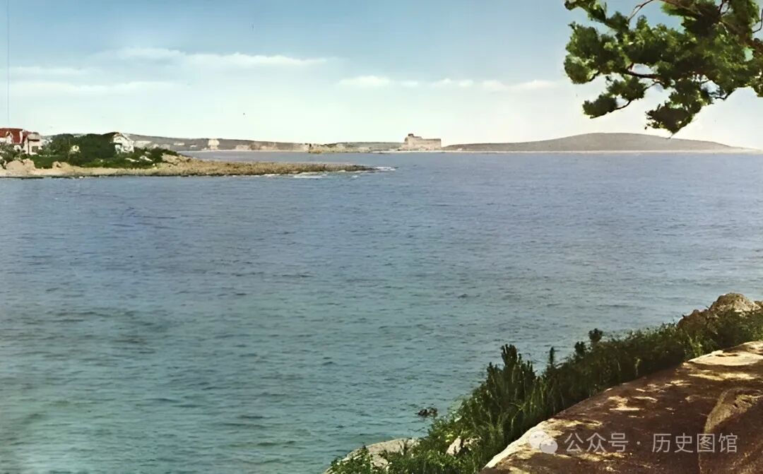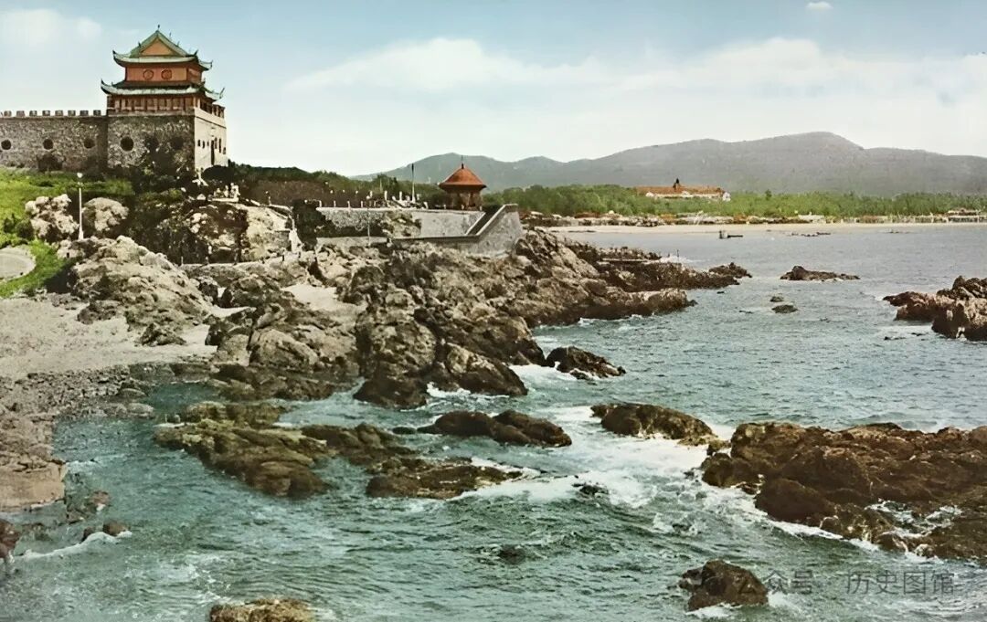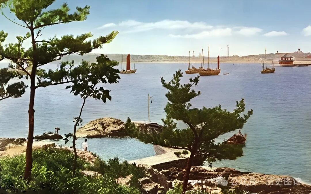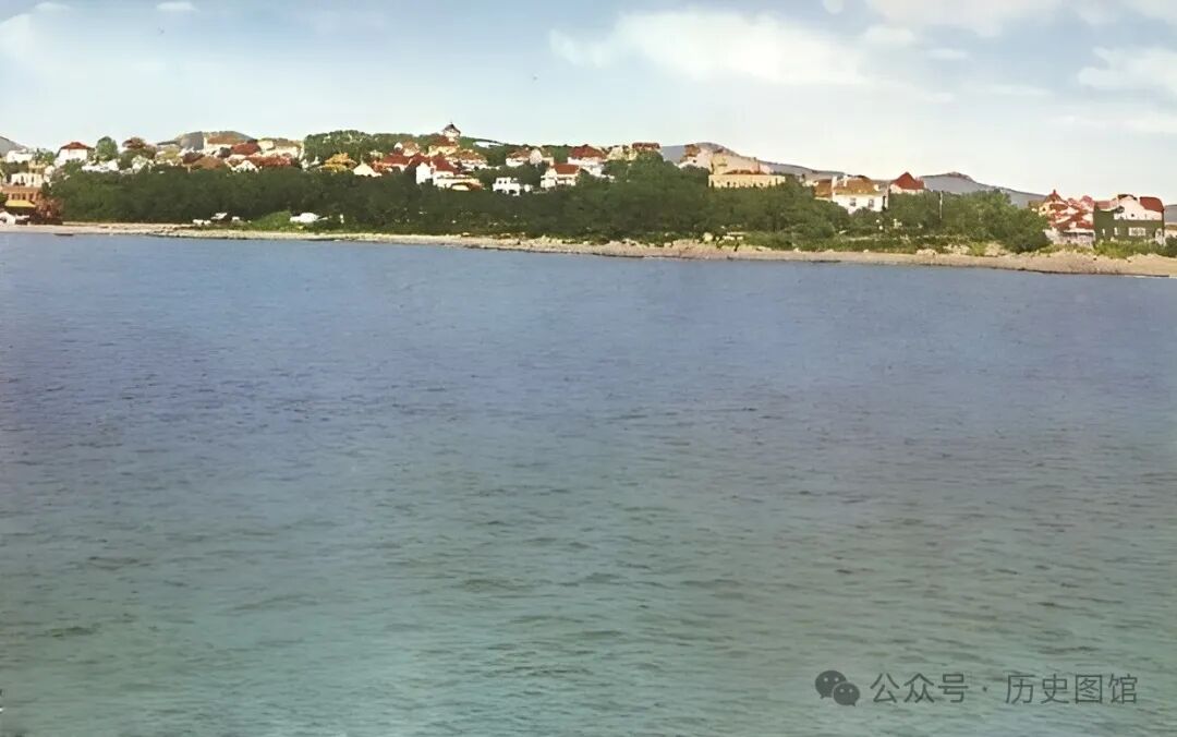 30年代,山东青岛海滨风光。山海相连,山光海色,红瓦绿树、碧海蓝天。海边没什么游客。