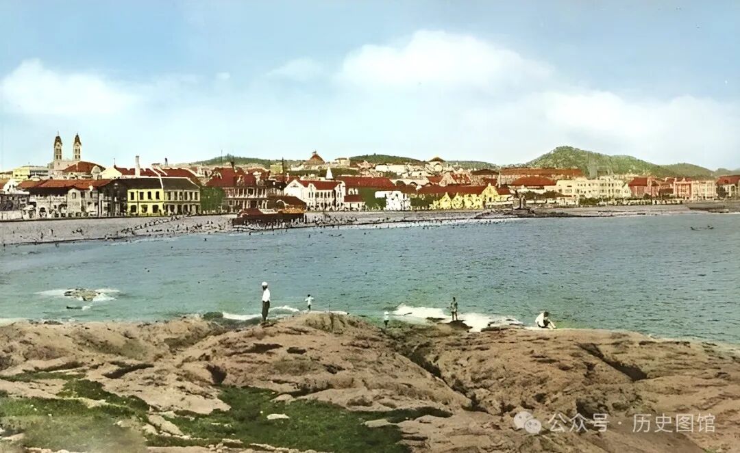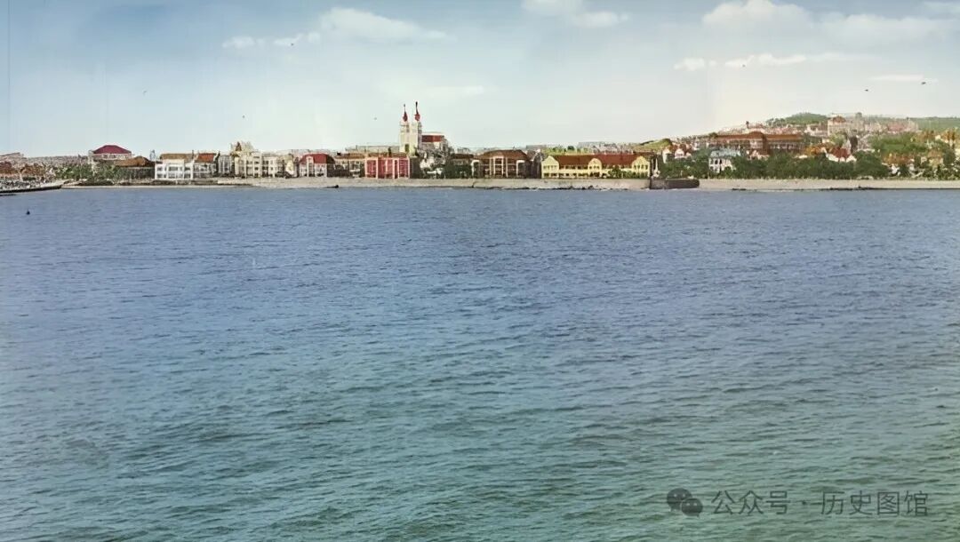 30年代,山东青岛海滨风光,令人惊叹。烟波浩渺的海水,清澈蔚蓝。海边没什么游客。青岛城区大部分建筑是欧式风格。两座高大的尖顶建筑,是当时的一座教堂。