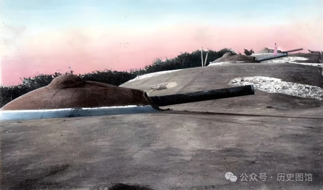 30年代,山东青岛海岸炮台景象。三座炮台一字排开,炮口指向海面。不过,从照片上看,这些大炮已经落后,看上锈迹斑斑。