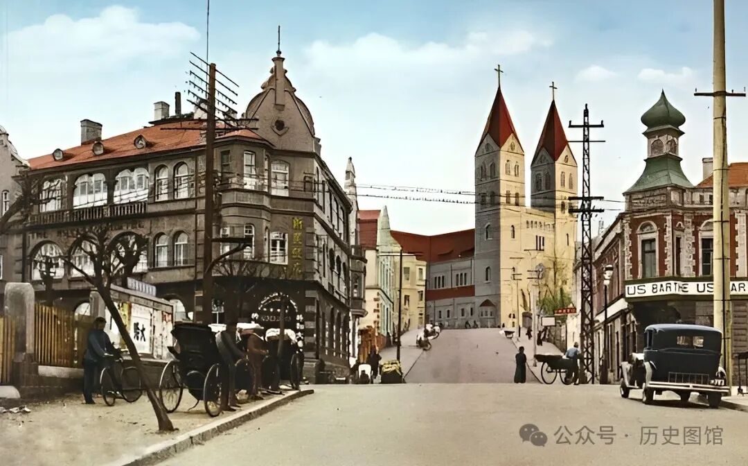 30年代,山东青岛教堂景象,本名圣弥厄尔教堂,始建于1932年。双塔塔身高56米,是当时山东省最高的建筑。也是中国唯一的祝圣教堂。现为省级重点文物保护单位。