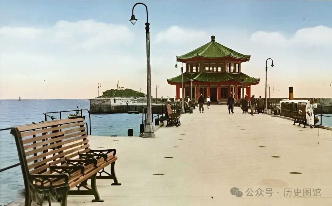 30年代,山东青岛,伸入大海之中的栈桥。青岛栈桥,全长440米,宽8米。始建于清光绪十八年(1892年),是青岛最早的军事专用人工码头建筑。栈桥尽头有两层八角楼,名"回澜阁"。当时栈桥两侧,设置有休息长椅,欧式灯柱古色古香。