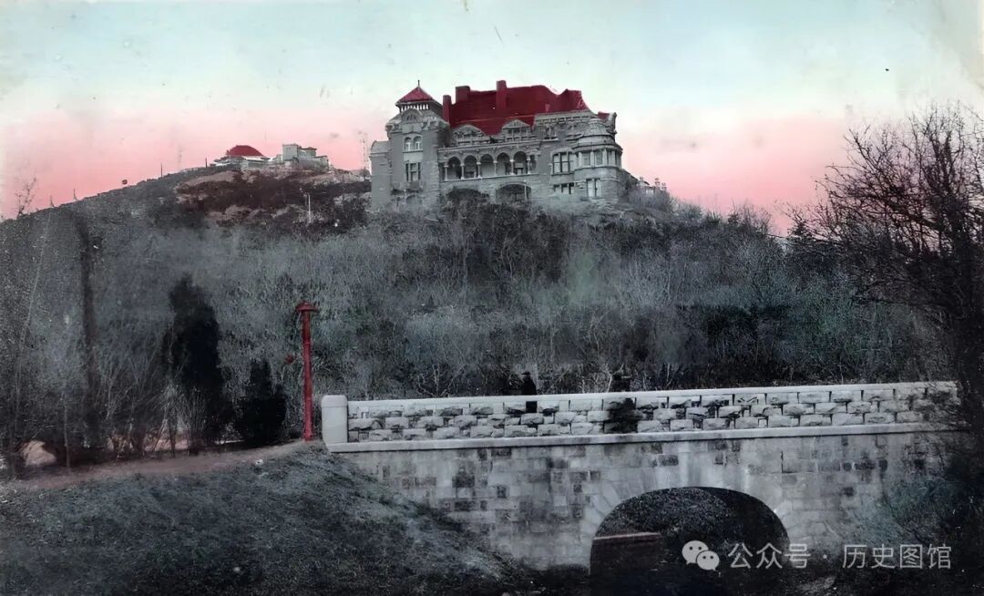 照片中,位于山顶的建筑,是当时的日军在青岛的司令官邸。远处,山顶最高处建筑,是无线电所。