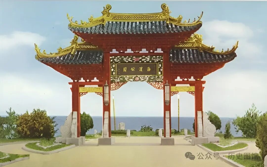 30年代,青岛海滨公园入口处,矗立着一座三间四柱三楼木牌楼。中间题额上“海滨公园”四个金色大字十分醒目。透过牌楼的柱子,能看到美丽的大海。