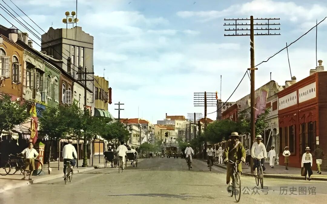 30年代,青岛山东路北段景象。街道两侧建筑高低错落,充满了年代感。街道两侧商铺都在开门营业。街上有不少骑自行车的,还能看到黄包车,人们都还是匆匆忙忙的样子。