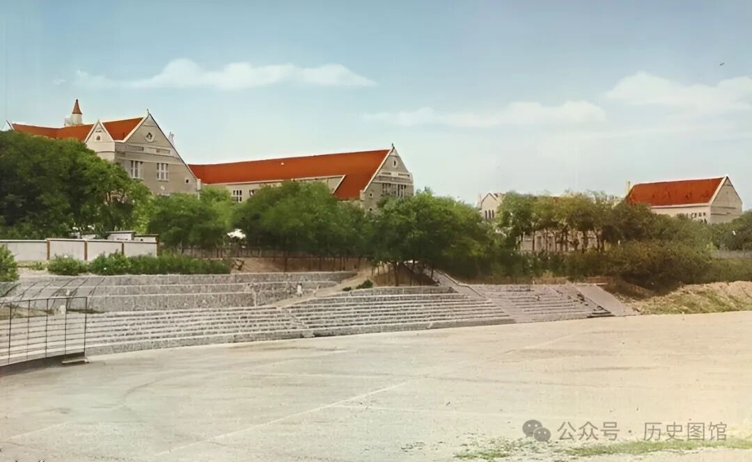 这座高大的建筑,是当时的青岛体育场,位于今青岛市市南区文登路。。该体育场始建于1933年,是青岛第一座体育场。当年,在青岛体育场内举办了第十七届华北运动会。
