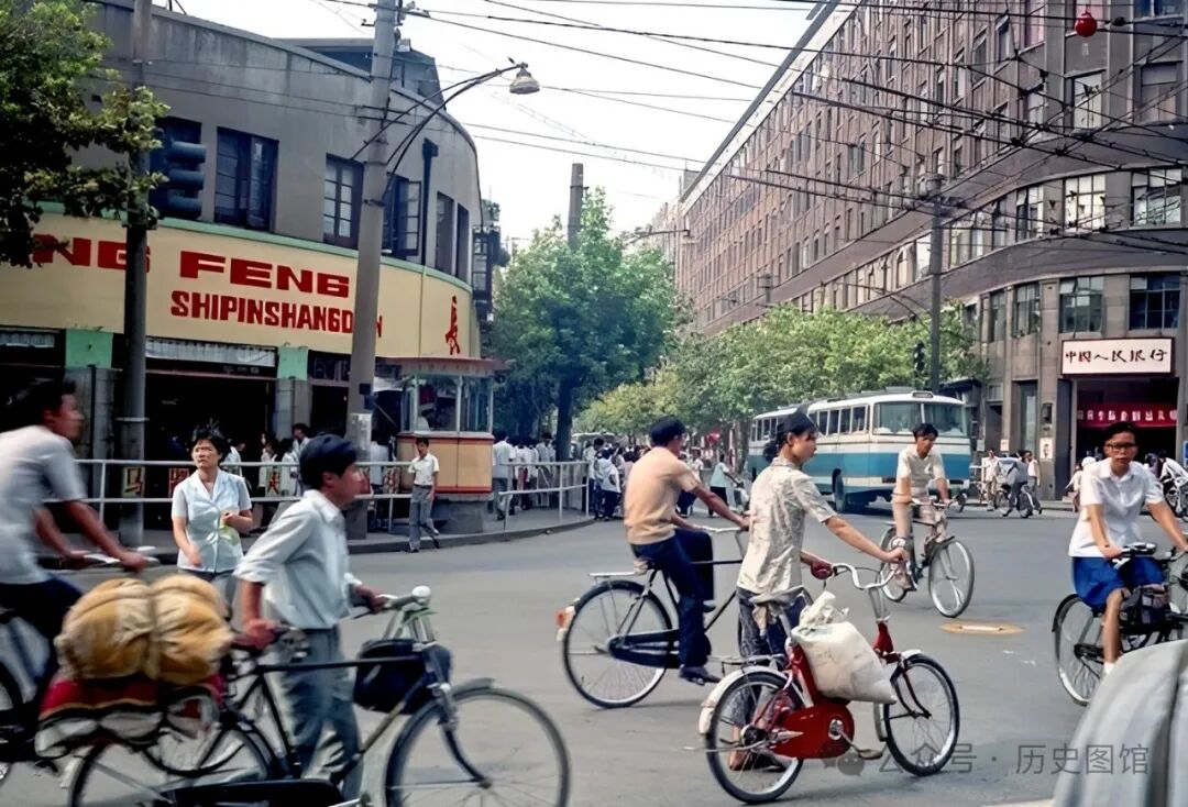 80年代,四川北路与海宁路附近景象。路口左侧建筑是长风食品商行,右侧是中国人民银行大楼。街道上很多人骑着自行车出行,蓝白相间的公交车驶过路口。