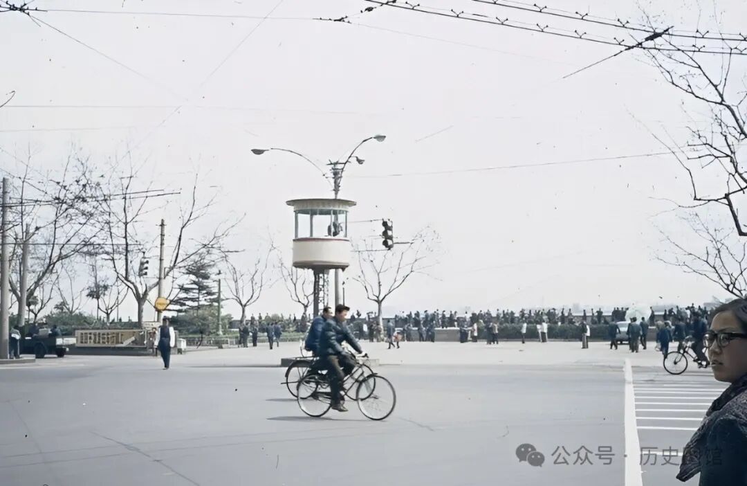 80年代,上海南京东路附近外滩景象。当时的南京路,街道宽阔,路口有一座警亭,警察袖子上套着白袖套。外滩黄浦江边的栏杆边,站满了欣赏江景的人群。