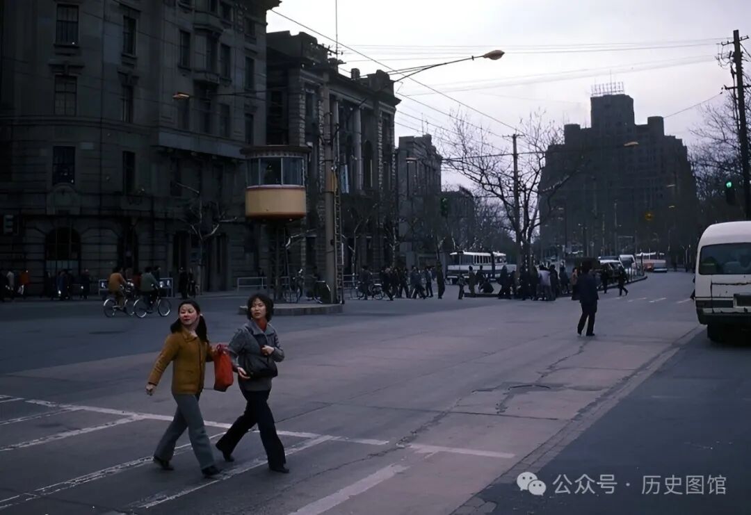 这是傍晚时分,上海北京路外滩附近景象。街道宽阔,路口也有一座警亭。远处,有乘客在等待公交车。两名女子提着包从斑马线上走过。