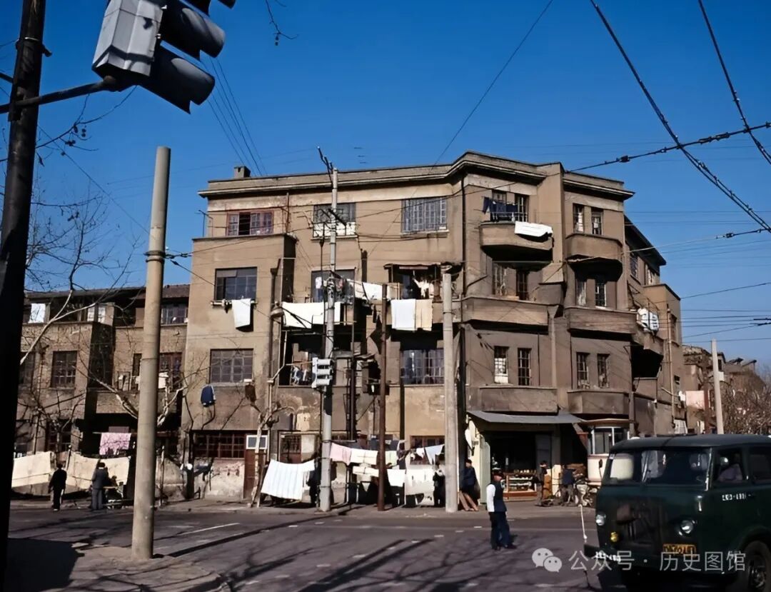 80年代,站在陕西南路建国西路附近,向西北方向望去。街角的筒子楼,看上去有些年头了。不少住户在窗户外面晒被子。十字路口有戴着白色袖套的警察在执勤,指挥交通。