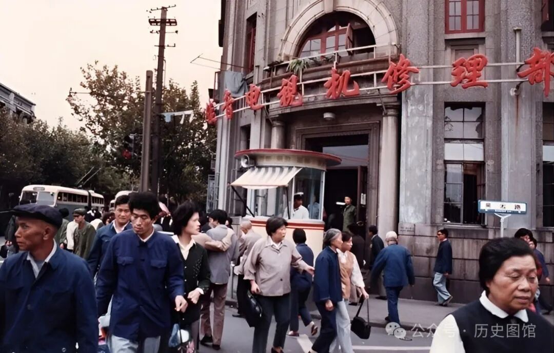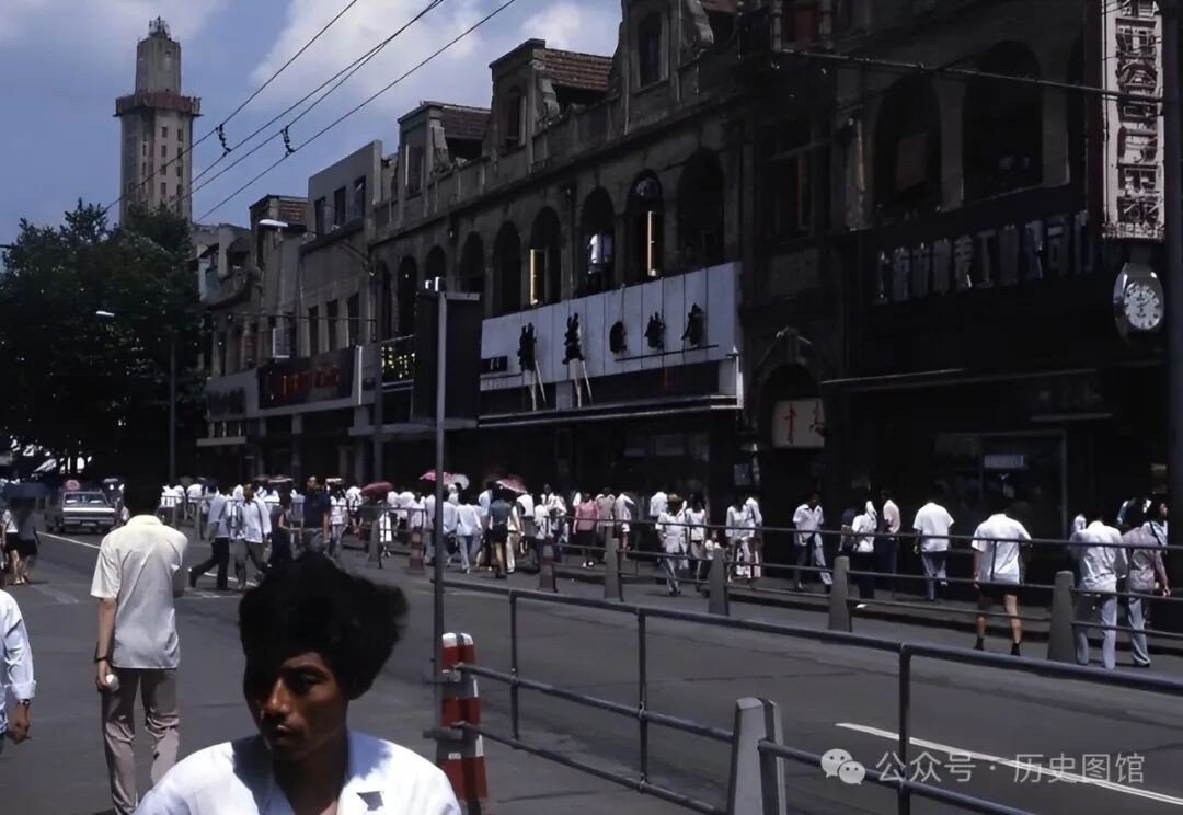 这就是上世纪80年代的上海南京东路,建筑很有年代感。逛街的人不少,大部分是游客。
