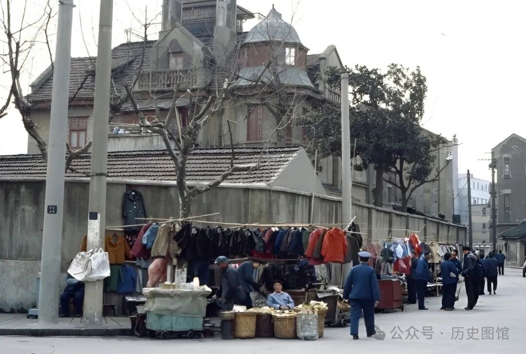 这张照片,也是拍摄于四川北路黄渡路,路口南侧的景象。这栋欧式建筑,是当年的天鹅宾馆。院墙外面,有一些小贩在摆摊卖衣服。旁边还有一个小吃摊。