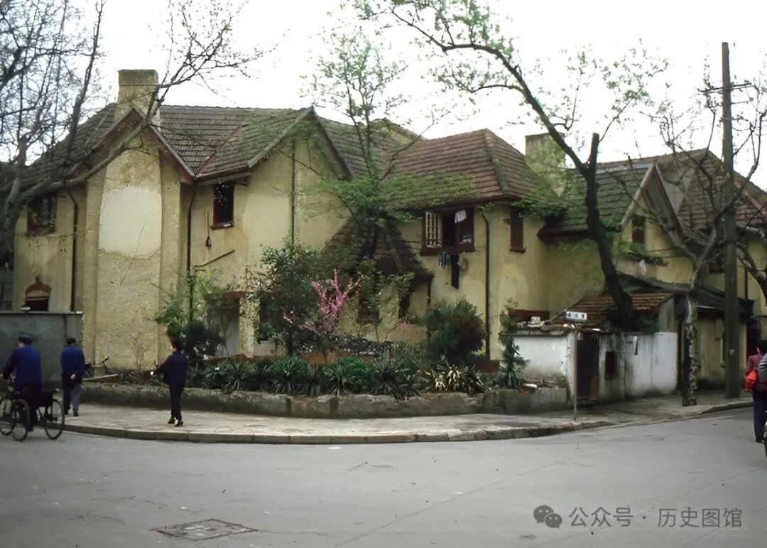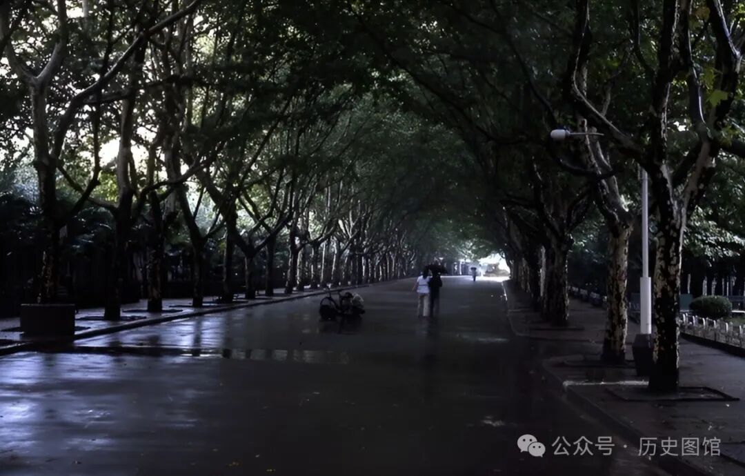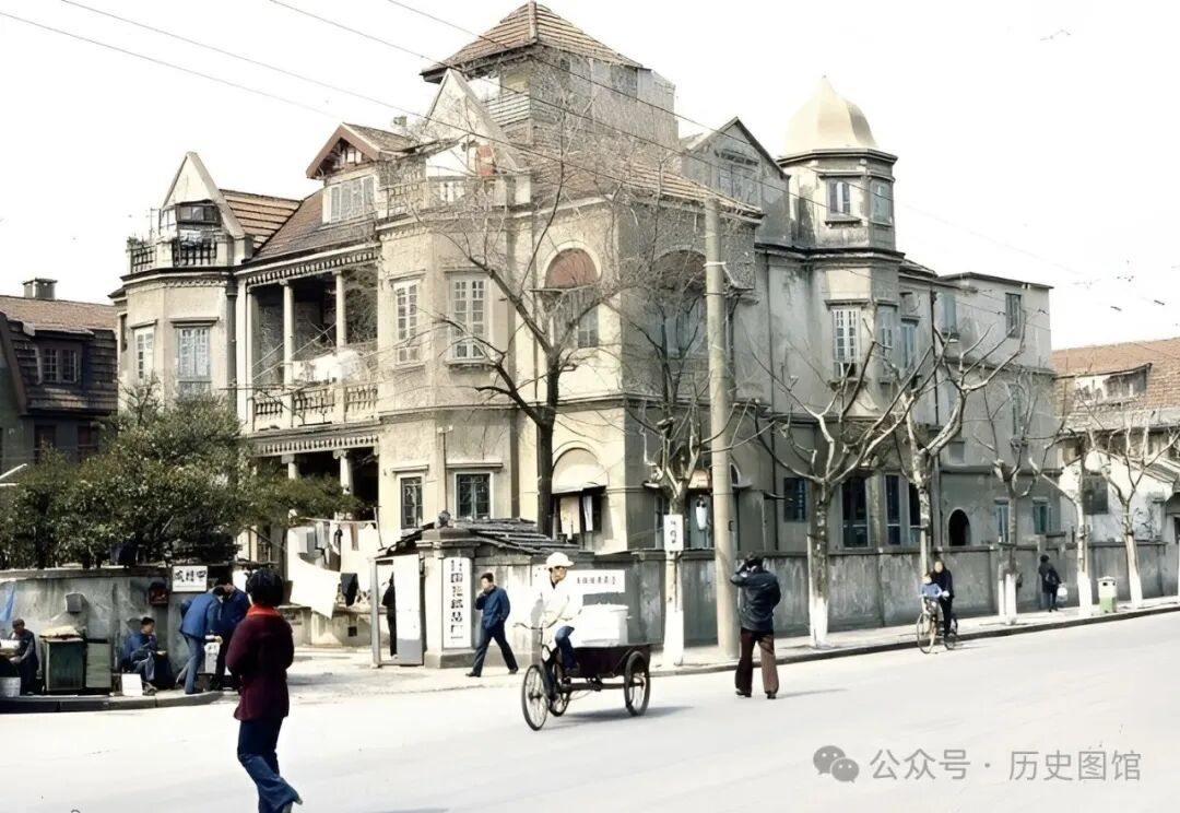 这是当时上海华山路上的景象。街边店铺都在开门营业,街上不少人骑行车。