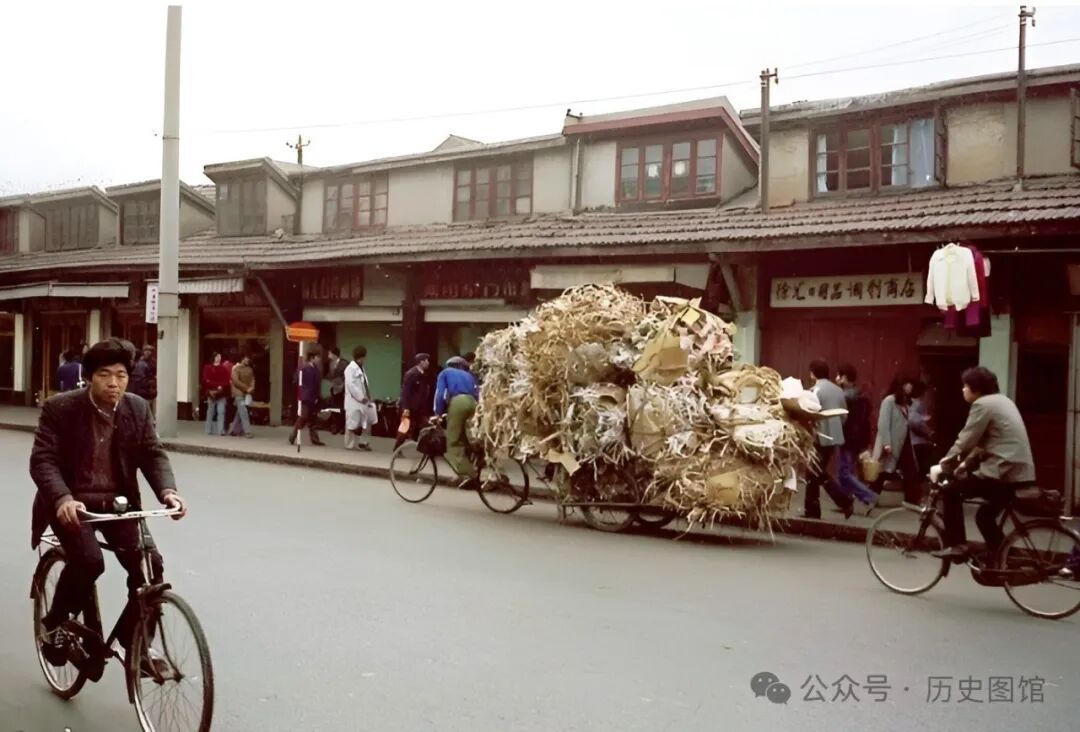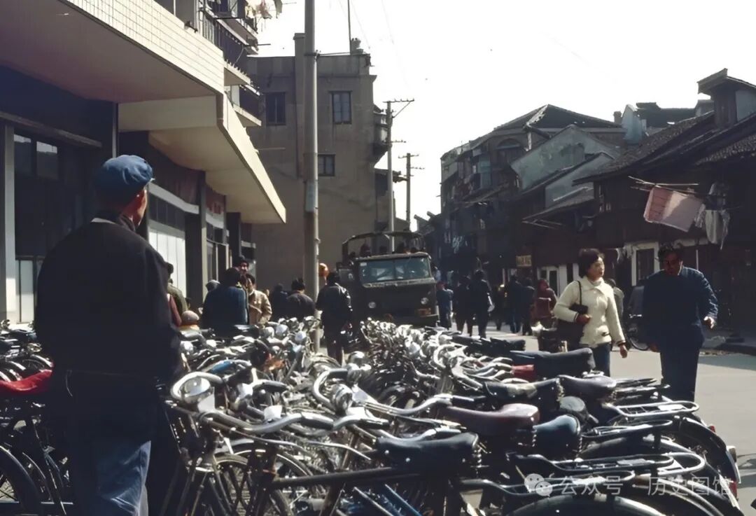 这张照片里的街道,是40多年前的上海旧校场路。旧校场路,许多上海人都非常熟悉,因为这里是去豫园商城游玩的必经之路。照片中,街边停着很多自行车,有专门看车的老大爷。