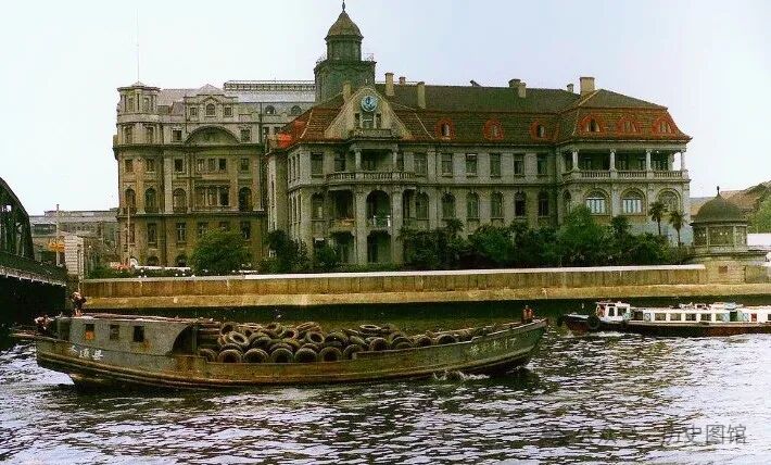 80年代,苏州河与黄浦江交汇处景象。河岸之上,能看到外白渡桥一角,桥头处有一座欧式建筑,即今俄罗斯驻上海总领事馆。该楼建成于1916年。黄浦路成为上海的领事馆区。