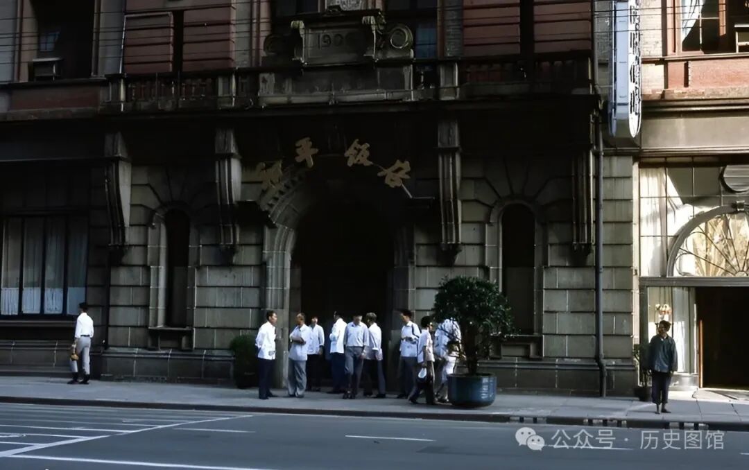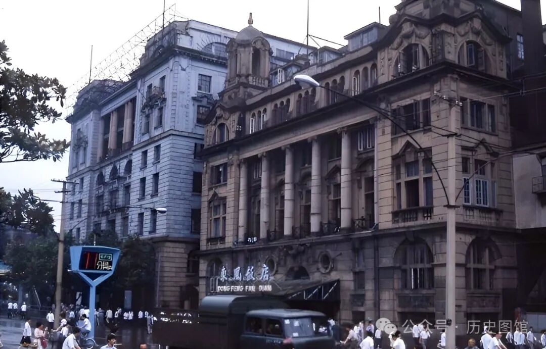 80年代,上海东风饭店大楼前景象。这是一座巴洛克风格建筑,始建于1912年。原来是上海总会所在地,又名英国总会、皇家总会。大楼前行人不少,当时流行穿白衬衫。