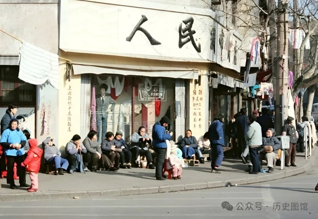 40多年前,人民路与河南路口景象。街角店铺门头上写着“人民绸布商店”,商店门口坐着很多老太太在晒太阳。