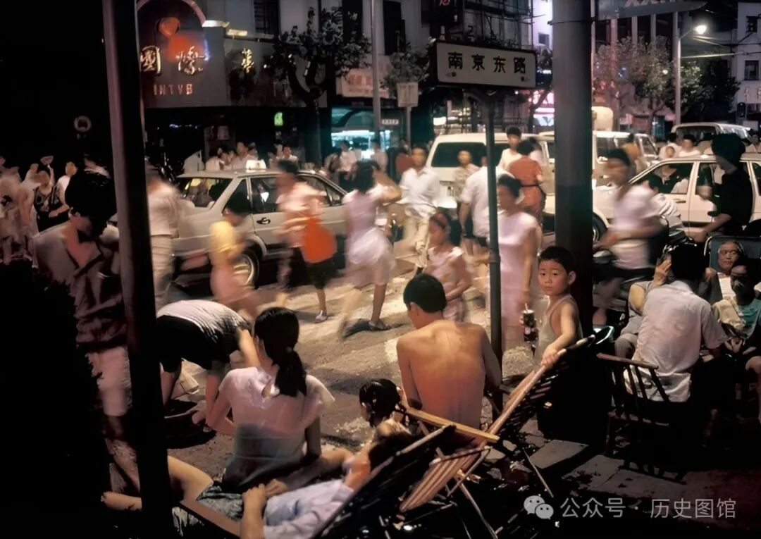 夜幕降临,华灯初上,南京东路与福建路口附近热闹非凡。街上行人来往穿梭,沿街店铺都在开门营业。路边不少人,坐在躺椅上纳凉,享受上海夜晚的惬意。