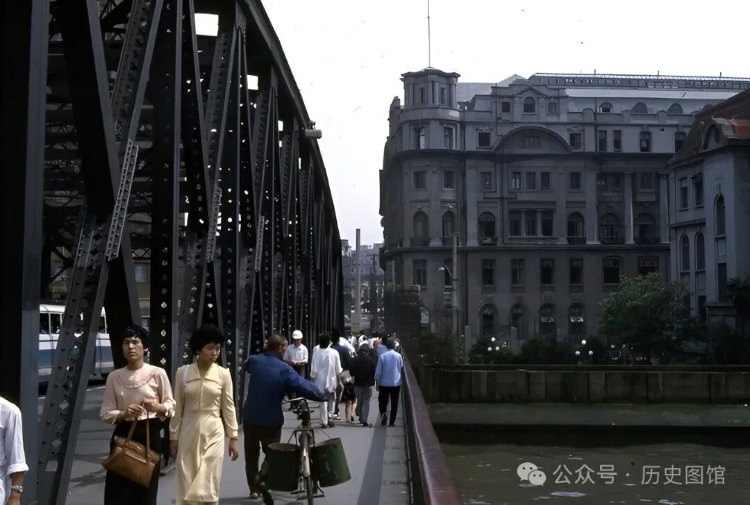这是位于苏州河上的外白渡桥,两名年轻女子从桥上走过,她们穿着连衣裙,提着皮包,看上去很时尚。
