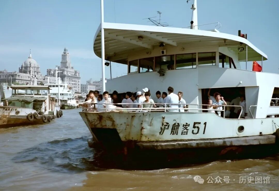 当时的上海黄浦江上,有很多这样的轮渡。船上有不少游客,站在船头欣赏黄浦江美景。远处,能看到位于上海外滩的江海关大楼与汇丰银行大楼。当时的黄埔江水,看上去是浑浊的土黄色。