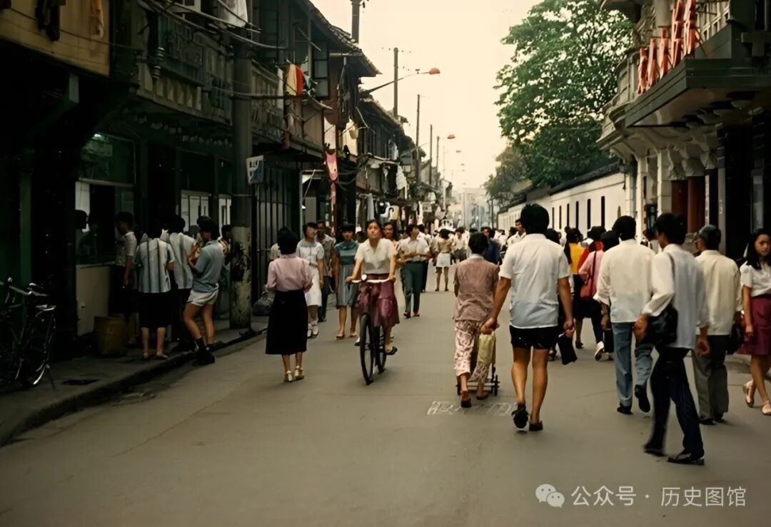 80年代,上海福佑路上景象。街道笔直,一眼望不到尽头。街上行人如织,一派热闹景象。