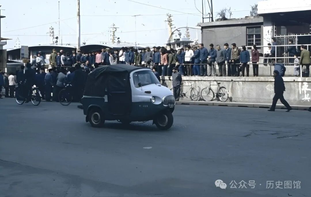 80年代,上海新开河路外滩附近景象。路边的高台上站满了人,下面发生了什么激烈的争吵,引得人们站在旁边看热闹。当时的街道上,一处有了三轮车在行驶。