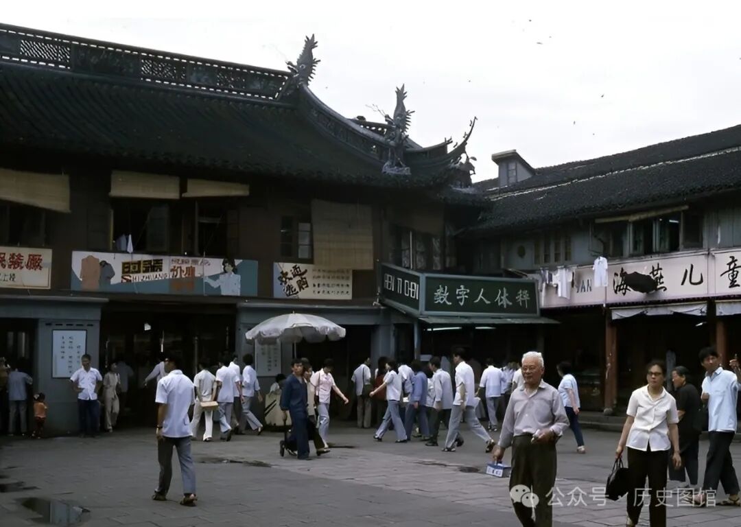 这里的建筑看上去古色古香,二楼广告牌子琳琅满目。这就是当时的豫园商城。