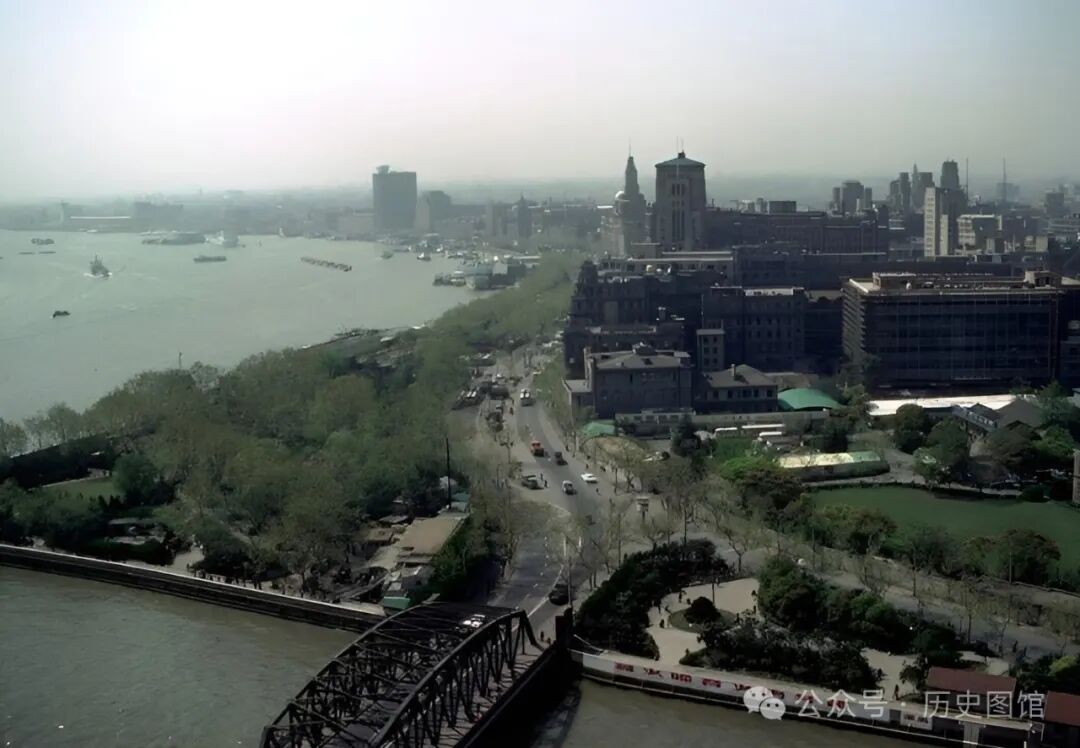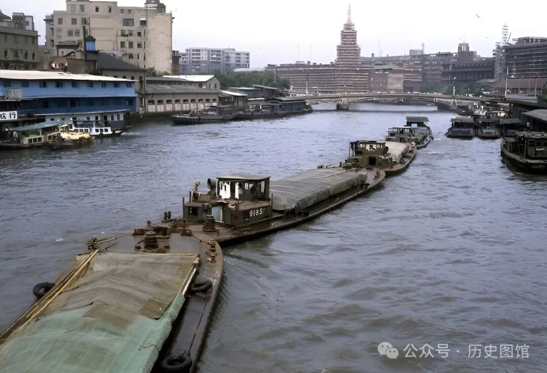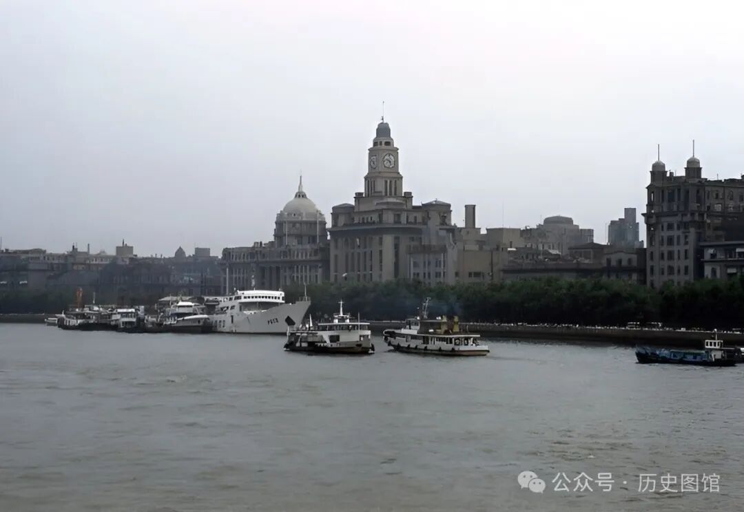 80年代,上海外滩及黄浦江风光看,江面上船只来往穿梭。当时的外滩,江海关大楼与汇丰银行大楼格外醒目。