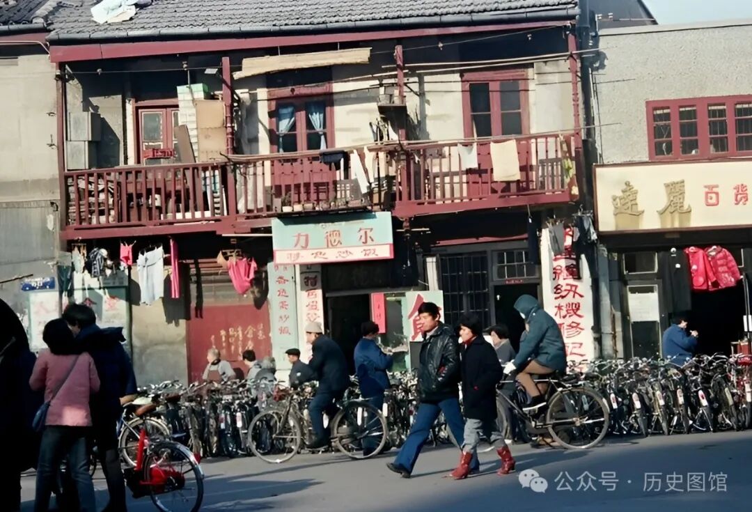 这是当时的凤阳路附近西藏路上景象。街边建筑古色古香,有小百货商店、小饭馆、修理缝纫机店。街边停着不少自行车,一名戴着围裙的老大娘在看车。不知道当时收不收费。