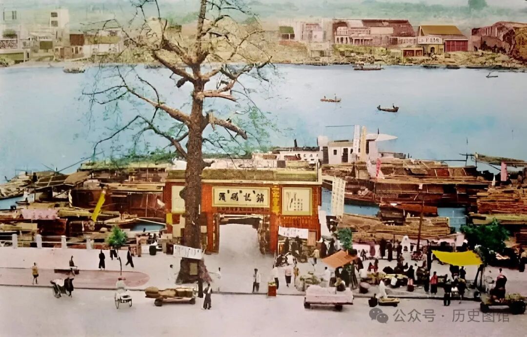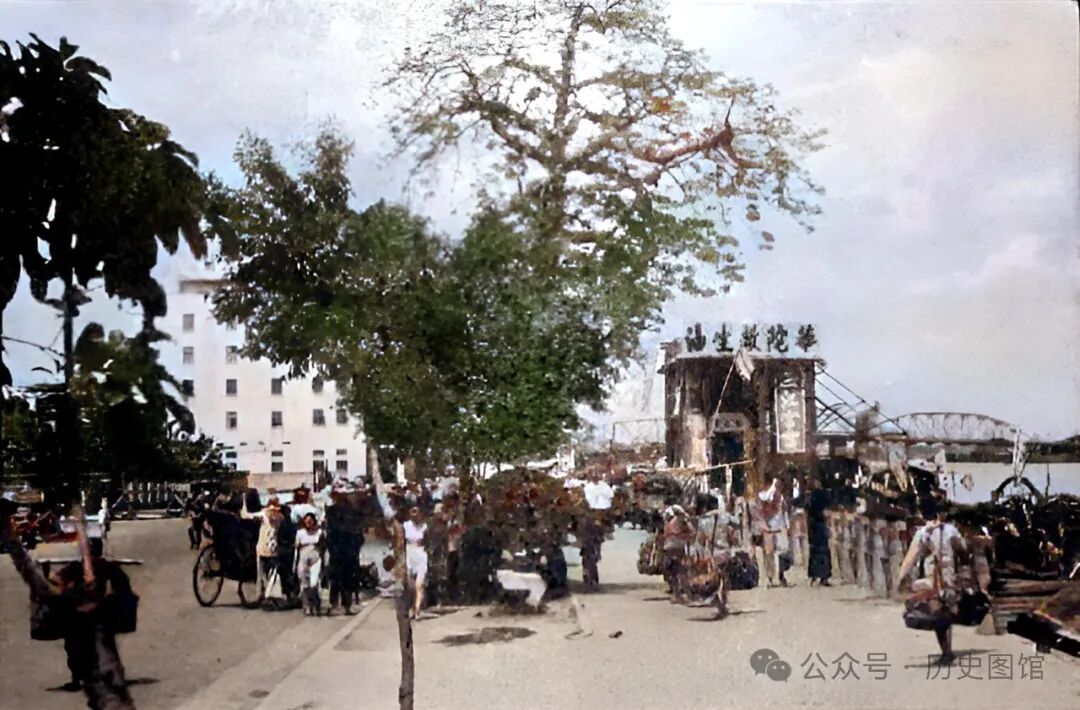 80多年前,广州长堤大马路码头景象。码头大门上有“华佗厂生油”字样。码头边上,停泊着船只,很多人在上下船。看起来,当时是一个很热闹的码头。远处,海珠桥清晰可见。