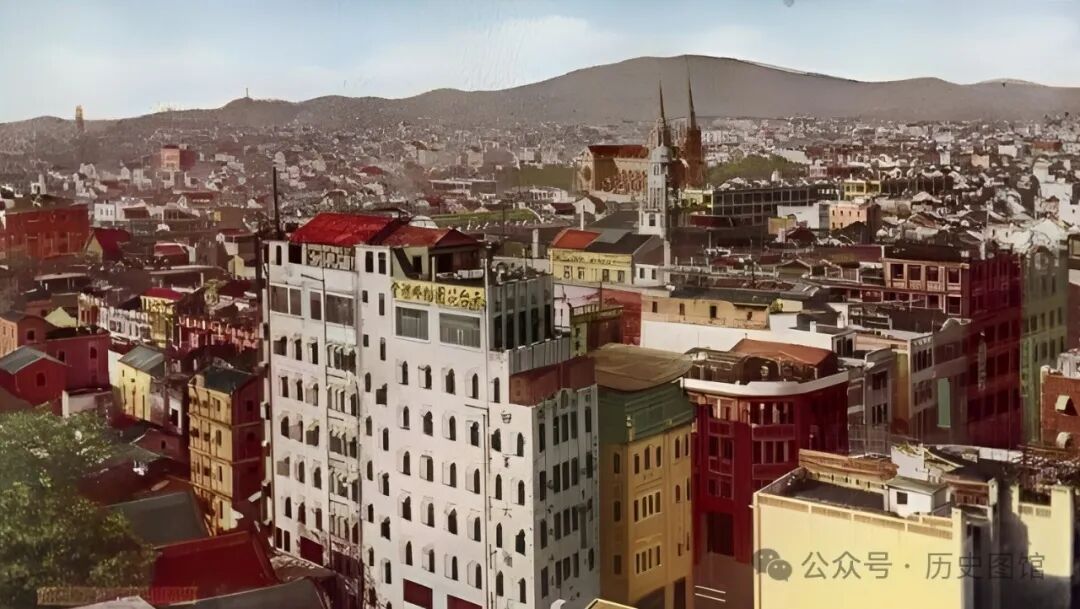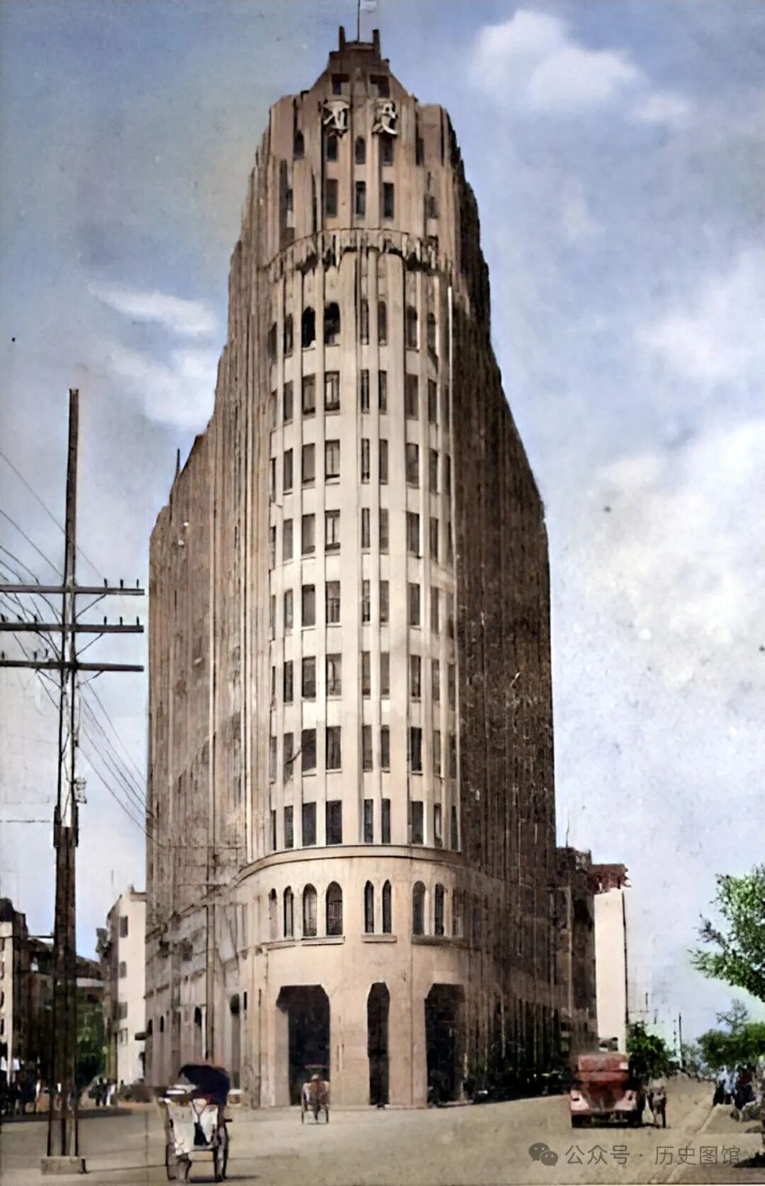 照片中,这座摩天大楼,是位于广州长堤大马路的爱群大酒店。该大楼始建于1934年,高15层,是当时广州最高的建筑。解放后,大楼又进行了多次扩建。