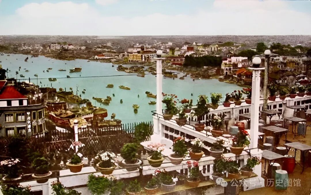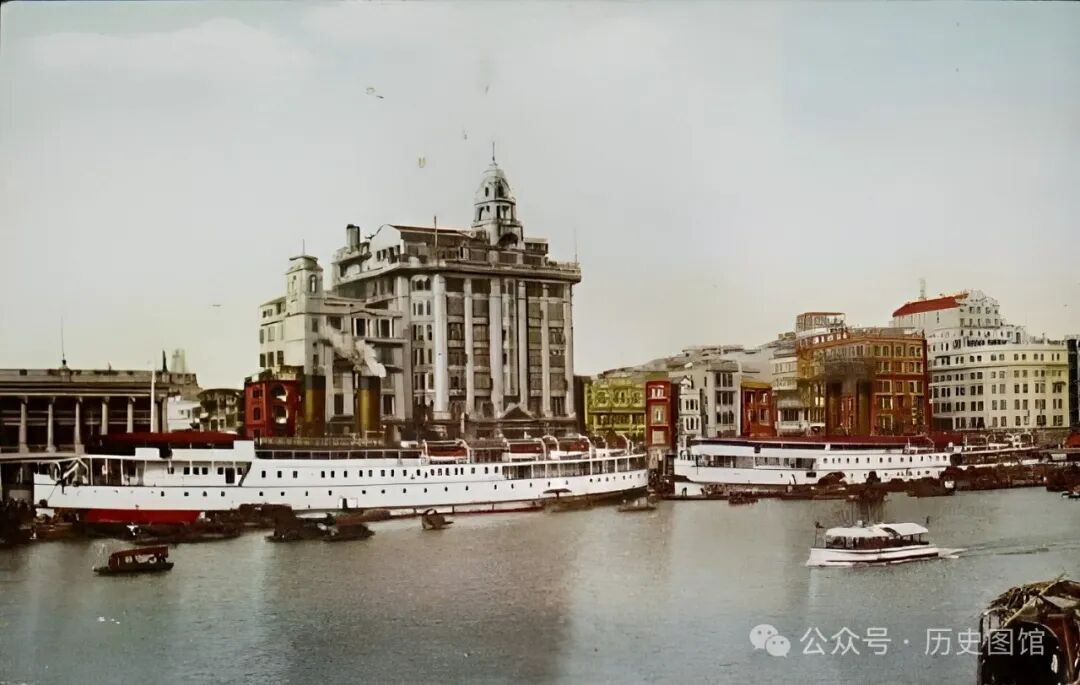 30年代,珠江对岸是一座码头,边上停泊着两艘白色巨型轮船。珠江水面上,大小船只来往穿梭,一派繁忙的景象。