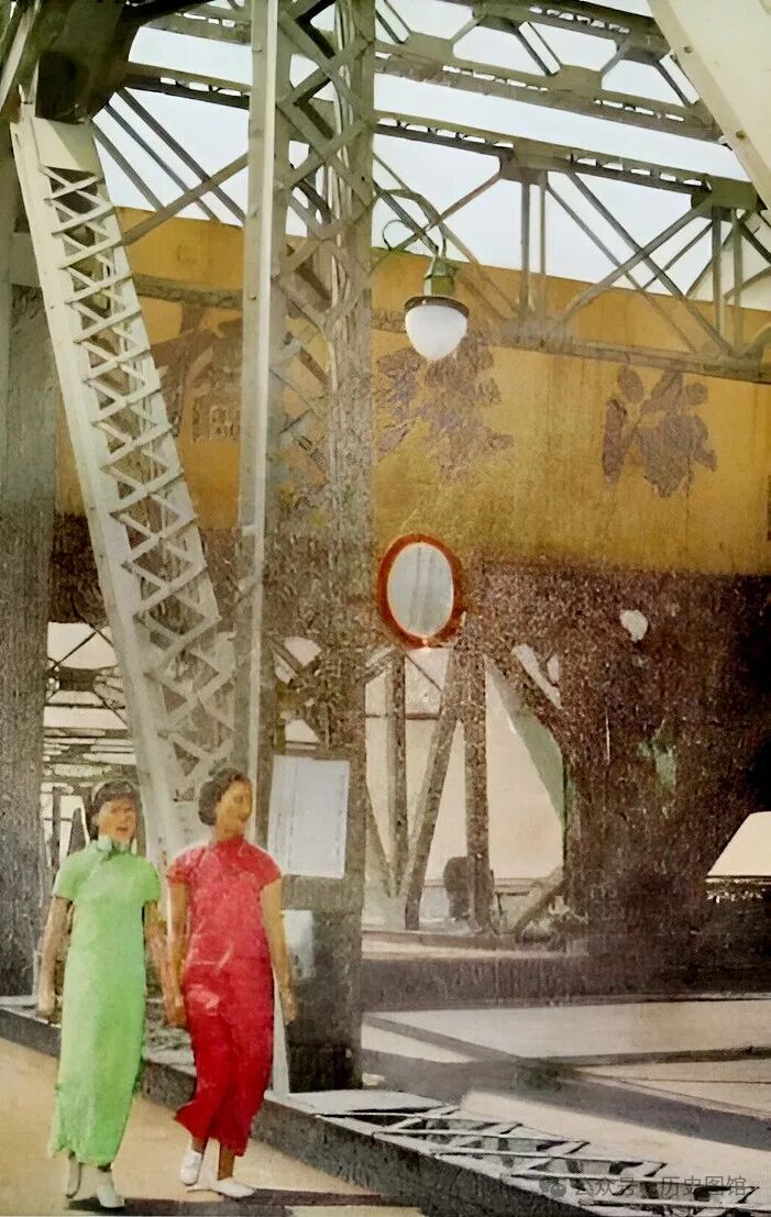 两名当地时尚美女身穿旗袍,手拉着手从海珠桥上走过。高大的钢架桥结构清晰可见,看上去非常壮观。大桥横梁上“海珠桥”三个大字十分醒目。
