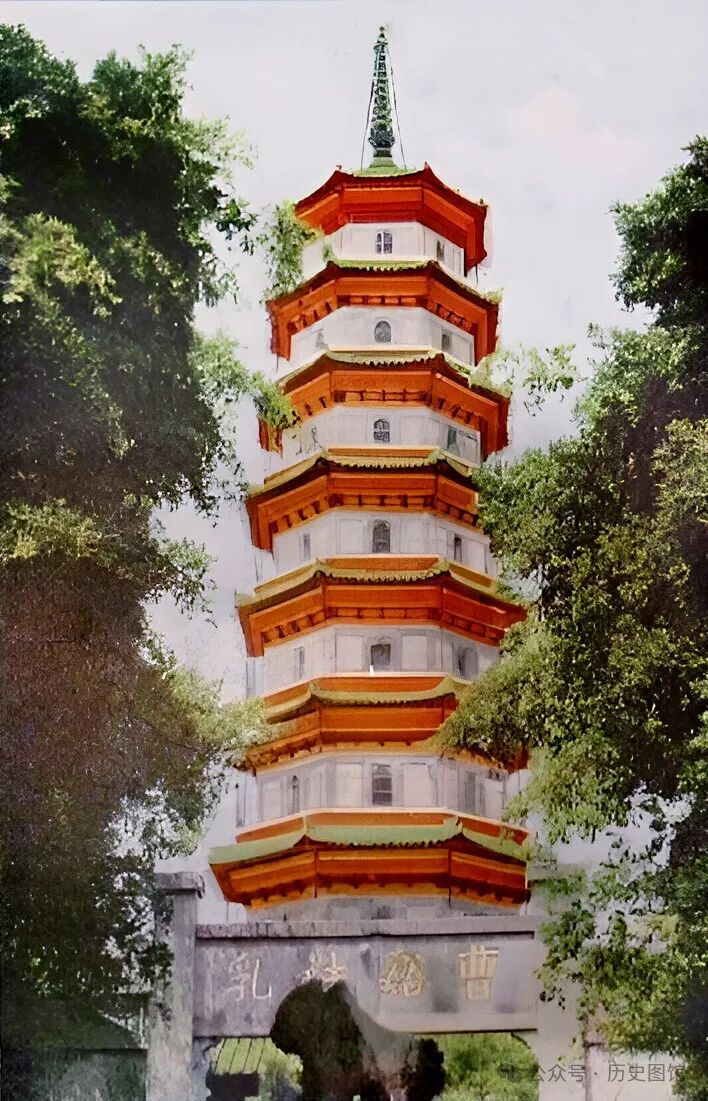 照片中这座古塔,是广州名刹六榕寺花塔。六榕寺,始建于梁大同三年(537年)。花塔,塔身高57米,11角形。外9层,内17层,是广州最有名的古代高层建筑。