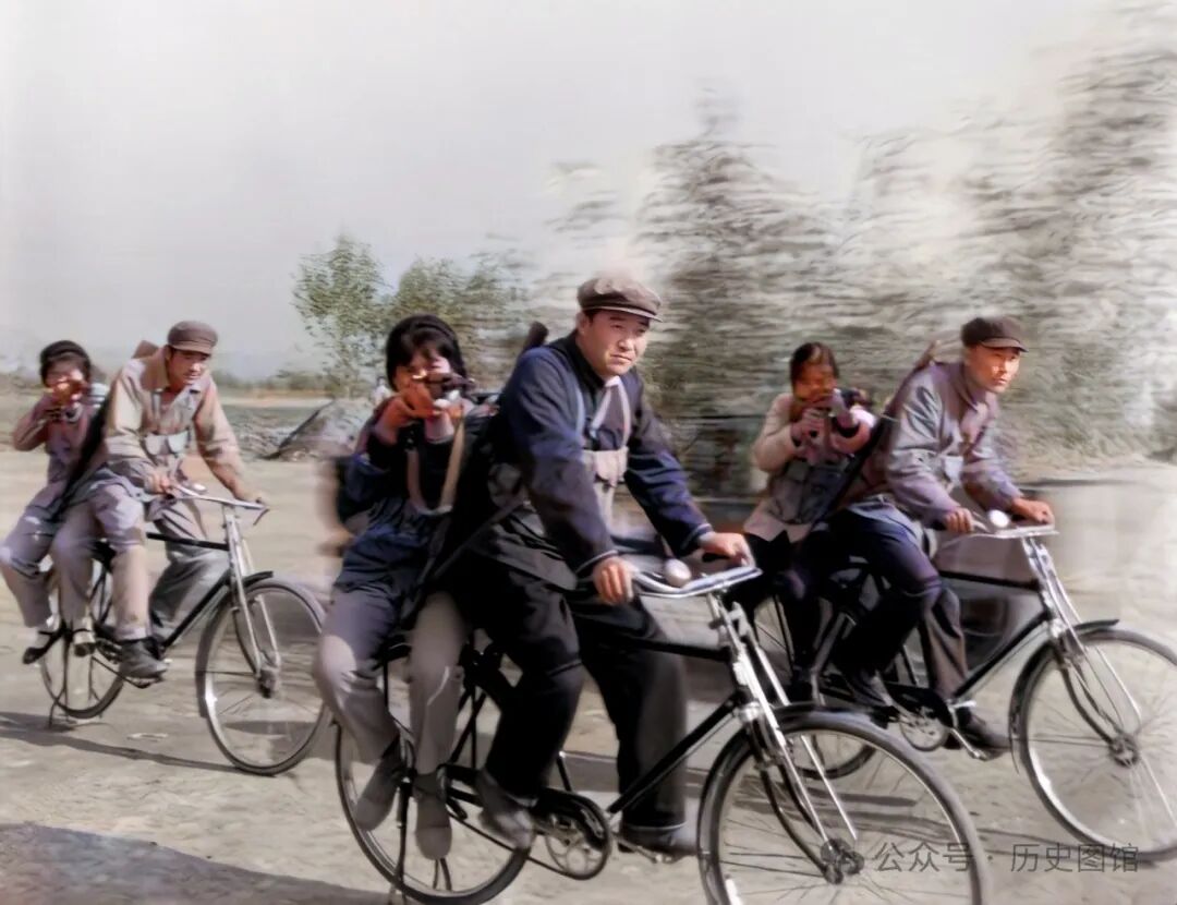 1975年,河南辉县铸造厂的民兵们,正在厂区外的大路上,进行运动射击训练。战友骑着自行车,女民兵坐在自行车后座上,在行进中完成举枪瞄准射击动作。